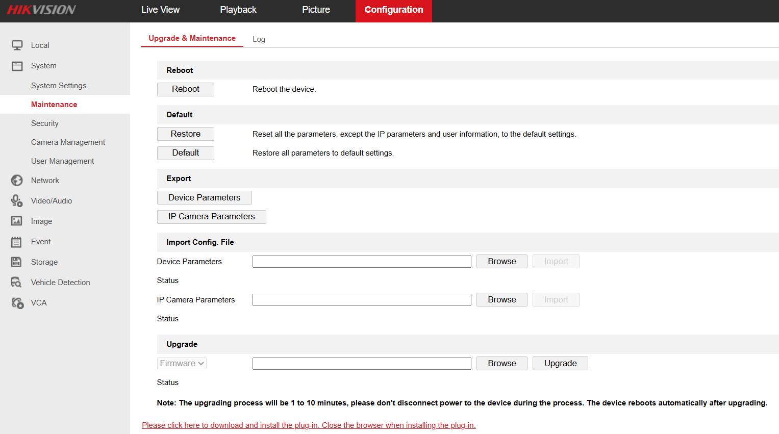 Install the plugin, or use iVMS4200 or try a different browser. I've had that with older devices several times and it's simply browser compatibility. iVMS4200 is your best bet. Once it's on newer version it'll likely work using a browser.