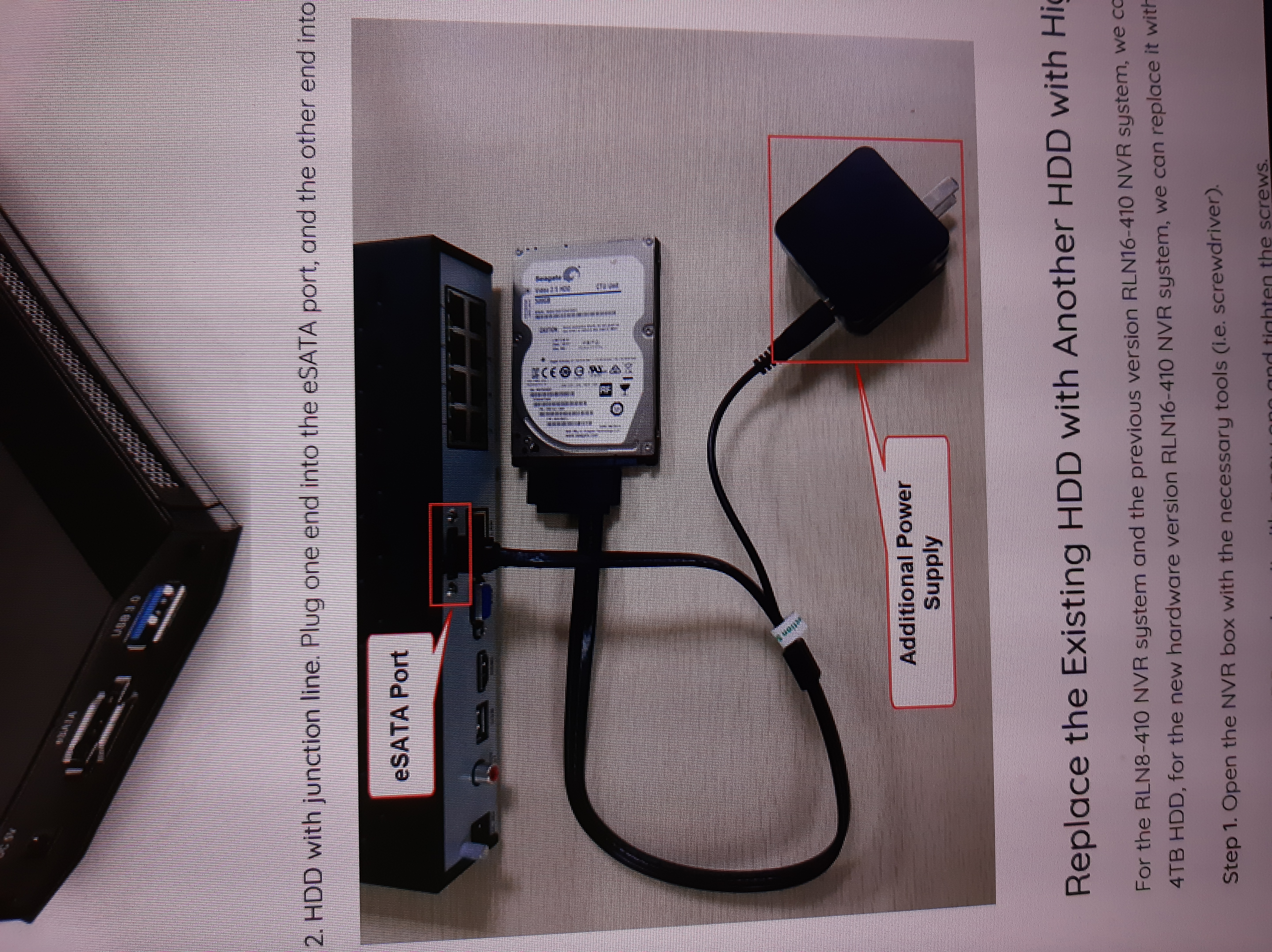 I have Reolink NVR system and wish to expand memory by adding external hdd. See attached photo from Reolink. Try as I might I cannot find a supplier of the cables required to power the 3.5" sata hdd and connect it to the NVR's eSATA port. Reolink haven't been able to help much although they did try.