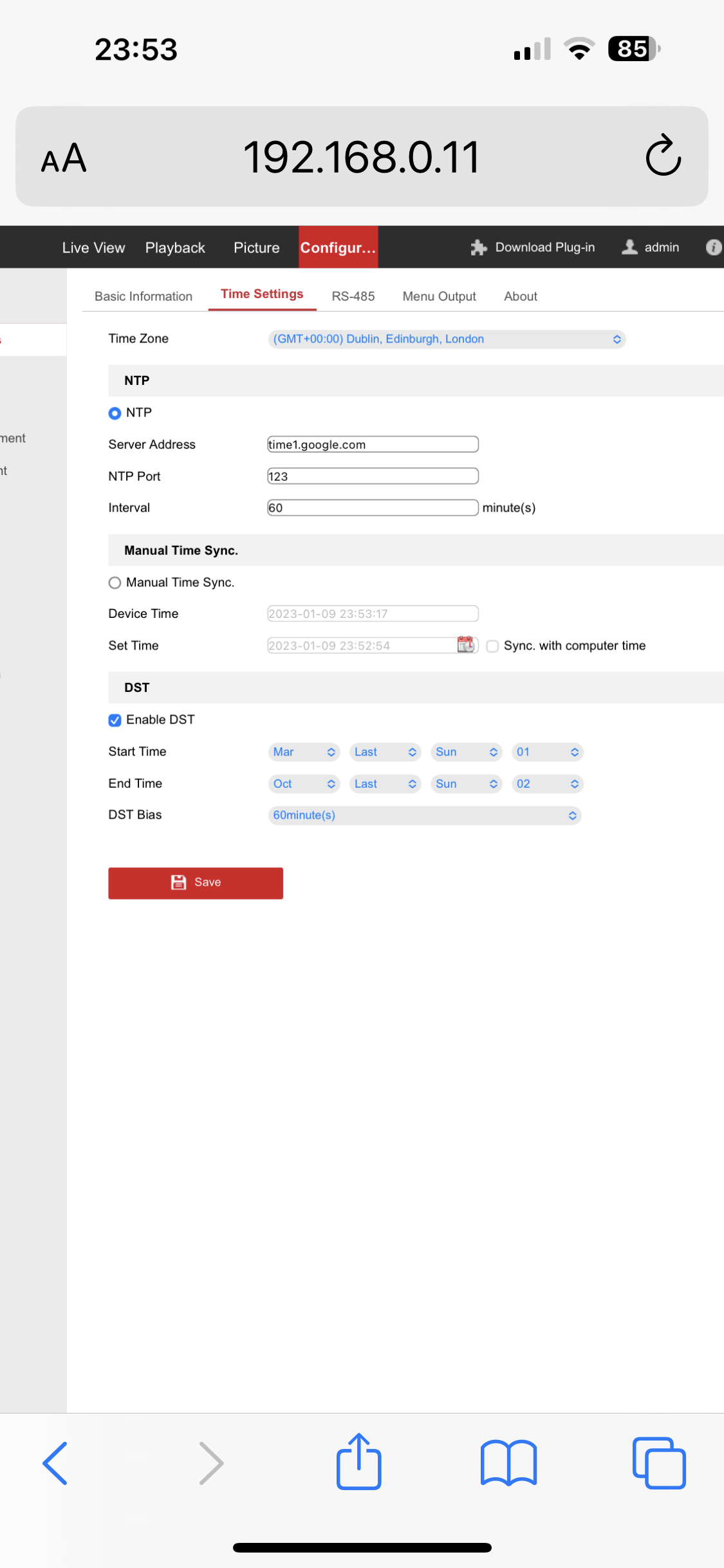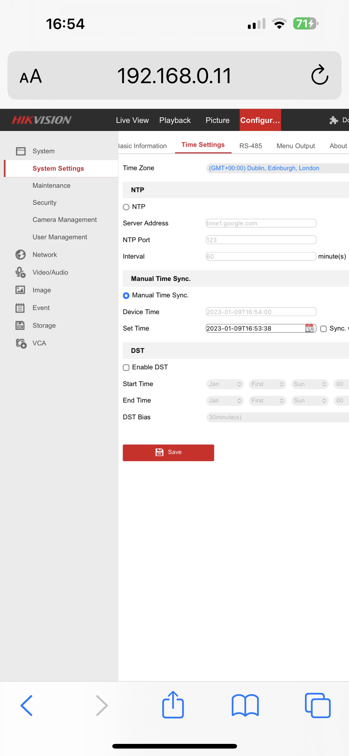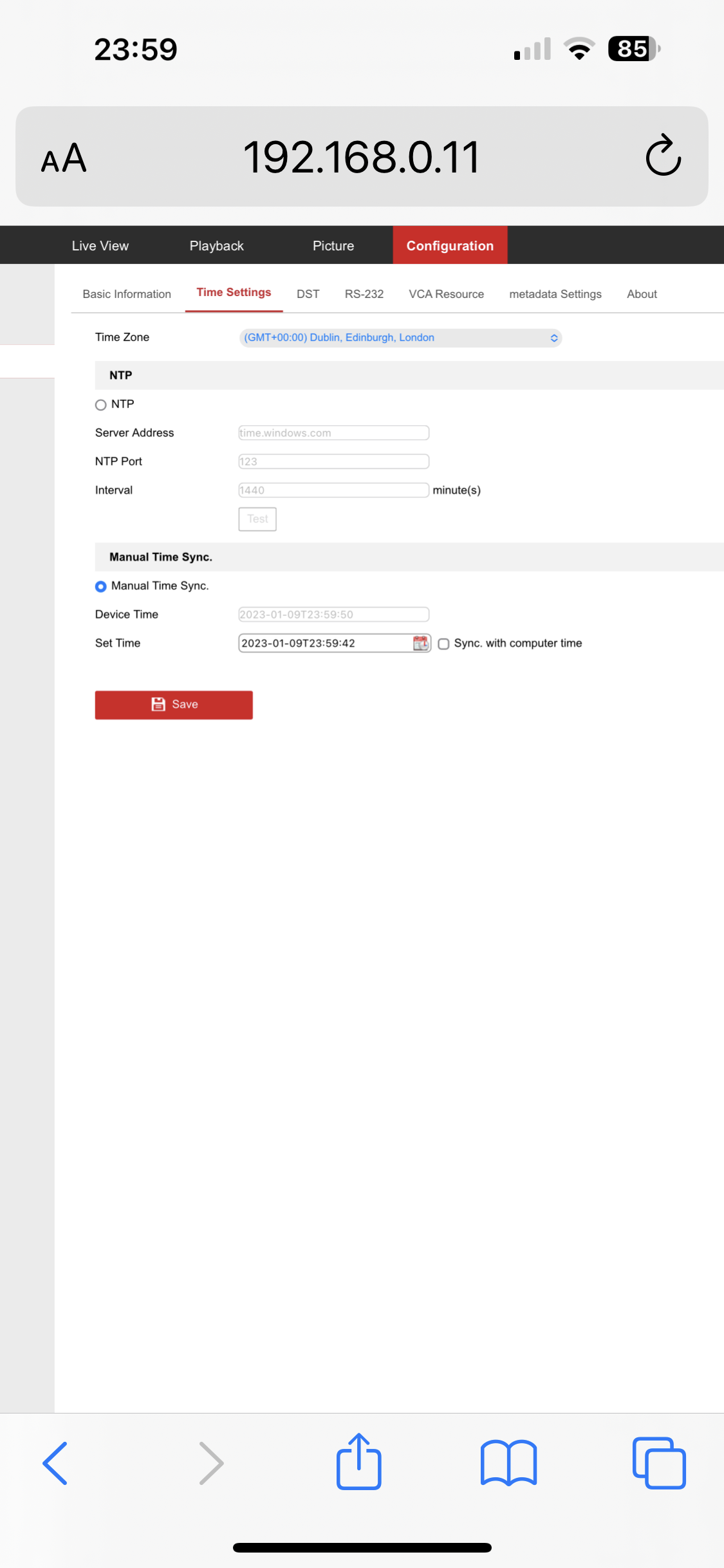 Hi thanks for your replies all 4 cameras are the same Hikvision DS-2CD2347G2-LU, firmware 5.7.2 build 211228, firmware property C-R-G5-0. I have just tried sync time with computer it says succeeded in the bottom of corner but if I click off it go back to time settings the sync time computer box has no blue tick device time is different to the time next to check box which is frozen to last time I pressed sync. Any ideas