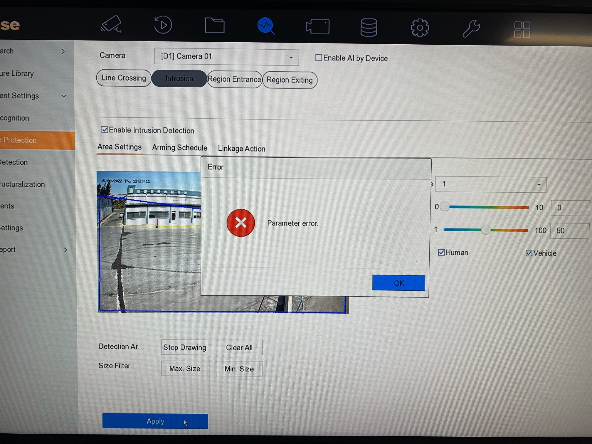 Intrusion detection has a little more fine adjustment to it, the initial set-up is the same in that you draw detection areas but that is the only similarity. After setting detection areas you can then set minimum & maximum detection sizes so that small animals or very large vehicles don't trigger the event, you also can adjust sensitivity and threshold which are explained below:
