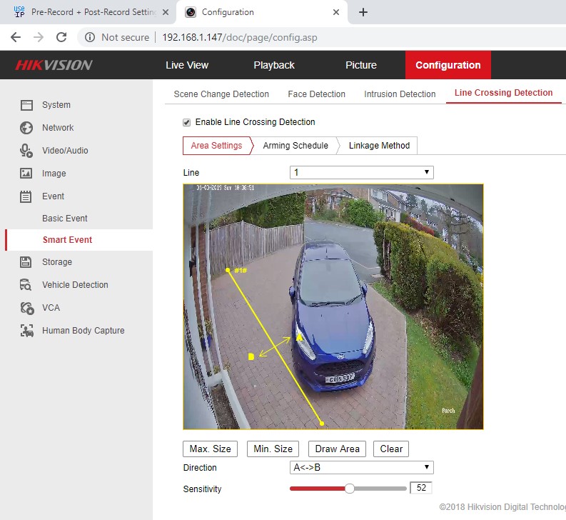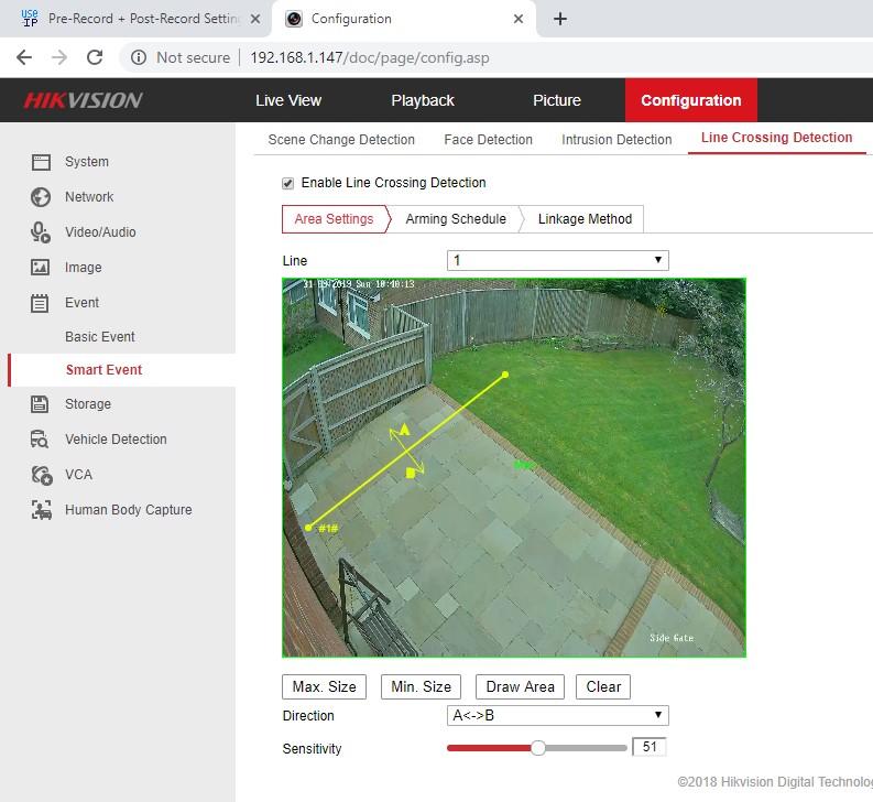 2.. Line crossing showing no footage recorded (linkage method "Notify surveillance centre" + "trigger recording channel D*)