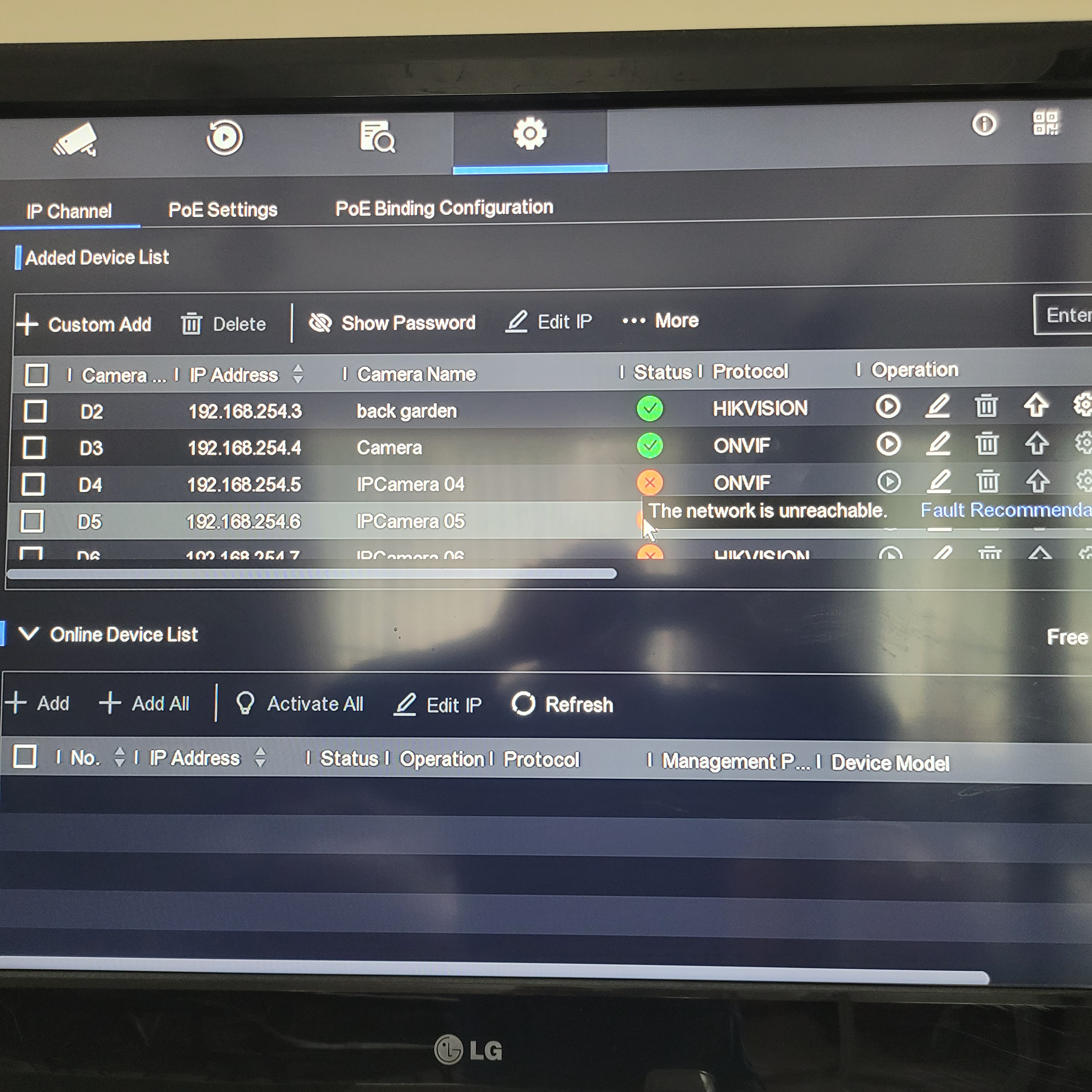 on the old nvr i used a poe injector (4 ports) for 3 cameras then a cat 6 cable to the nvr, with network cable to nvr, on the new nvr i connected the 3 old and 2 new cameras to ports on the nvr and network cable to nvr , they all said connected but only the 2 new cameras had a video, attached is a photo when i connected 2old cameras and 2 new cameras to poe injector the adress192.168.1.166 is one of the old cameras the other 2 are new cameras i have tried to change the 2new camera addresses but get message saying timed out, the2 new cameras won't connect to the web 20220315_100129.jpg