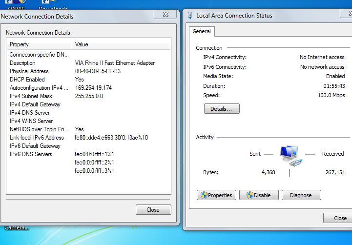 As you see in pic 1 also - the laptop ethernet Local Area Connection shows 'unidentified network' and will show 'network cable unplugged' when I disconnect anything. I was worried that the actual ethernet socket itself was malfunctioning in some way. I also checked the copper connectors inside the laptop ethernet socket - all looked clean/ok