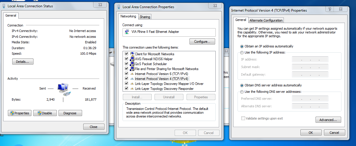 Pic 4 are the pages : Local Area Connection Status, Local Area Connection Properties and Internet protocol Version 4 TCP/IPv4