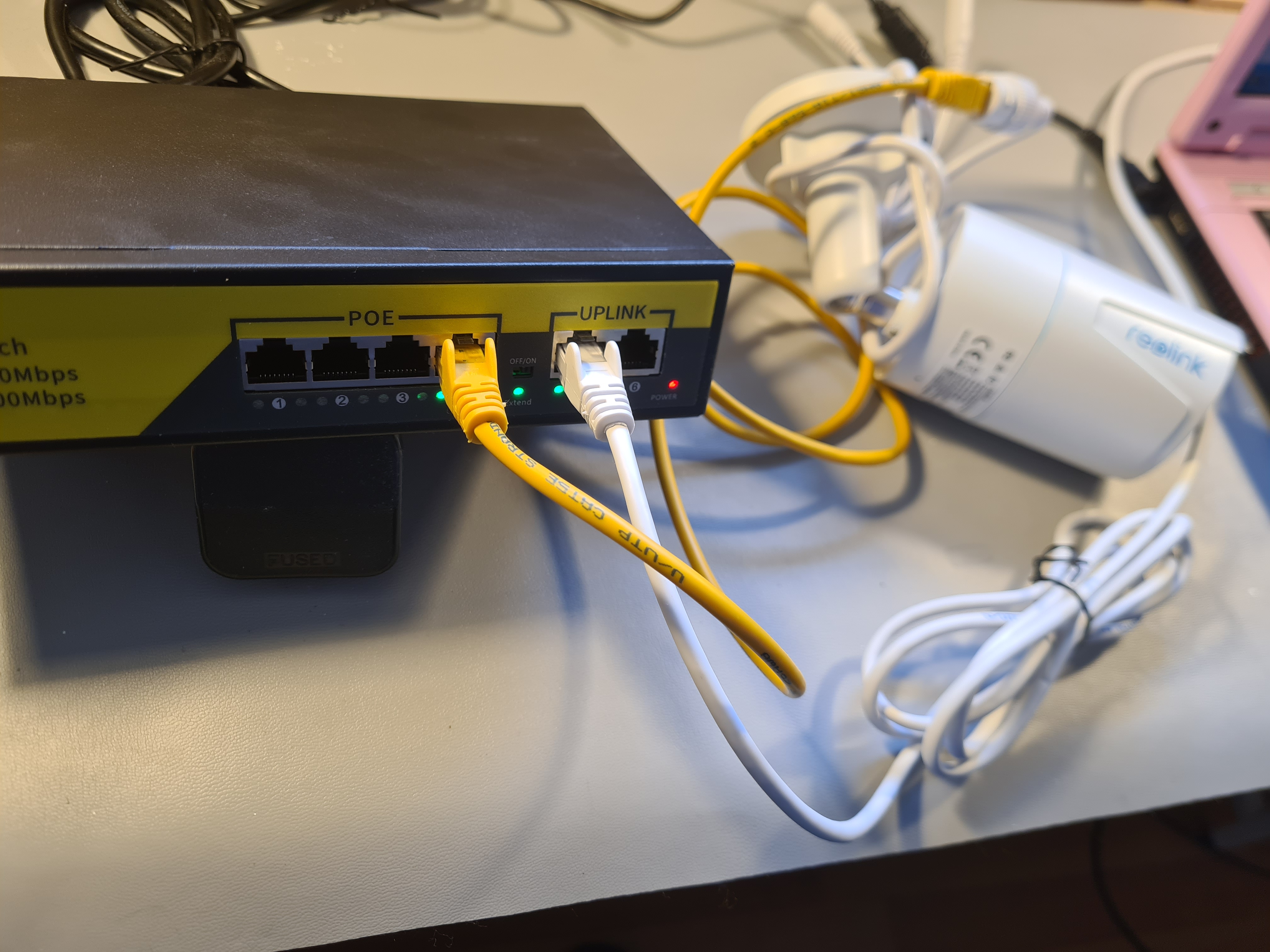 Pic 1 - yellow cable from camera pigtail socket to poe box port - white cable from poe box uplink port to ethernet socket in laptop