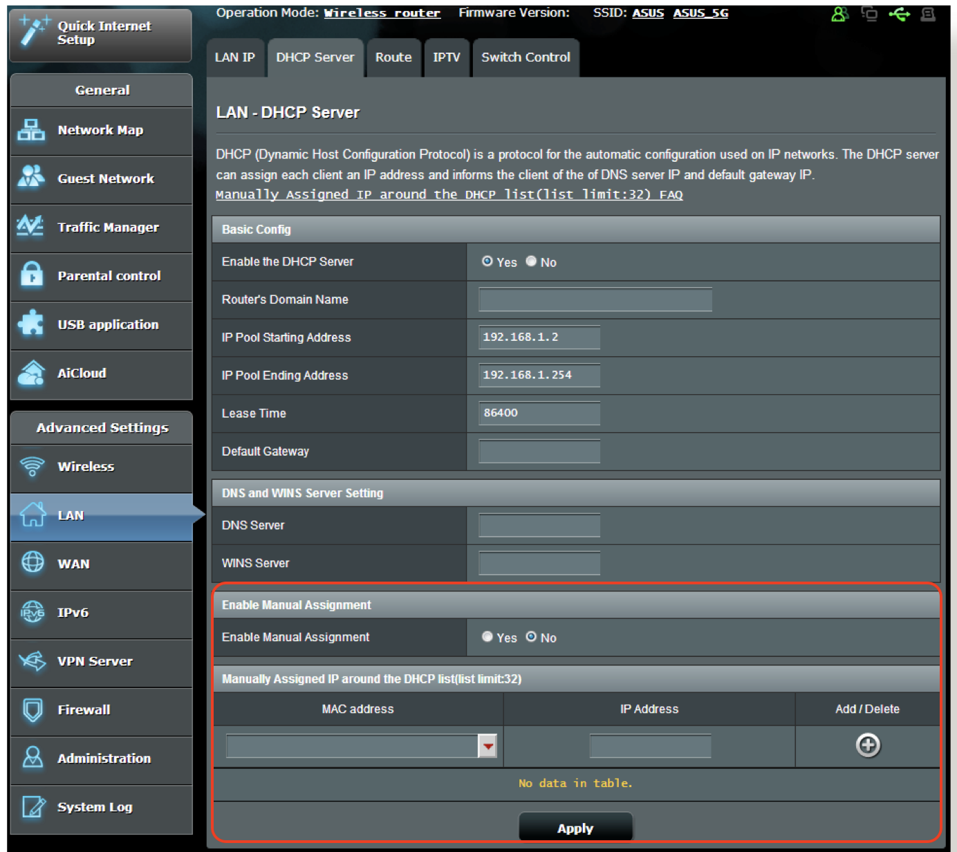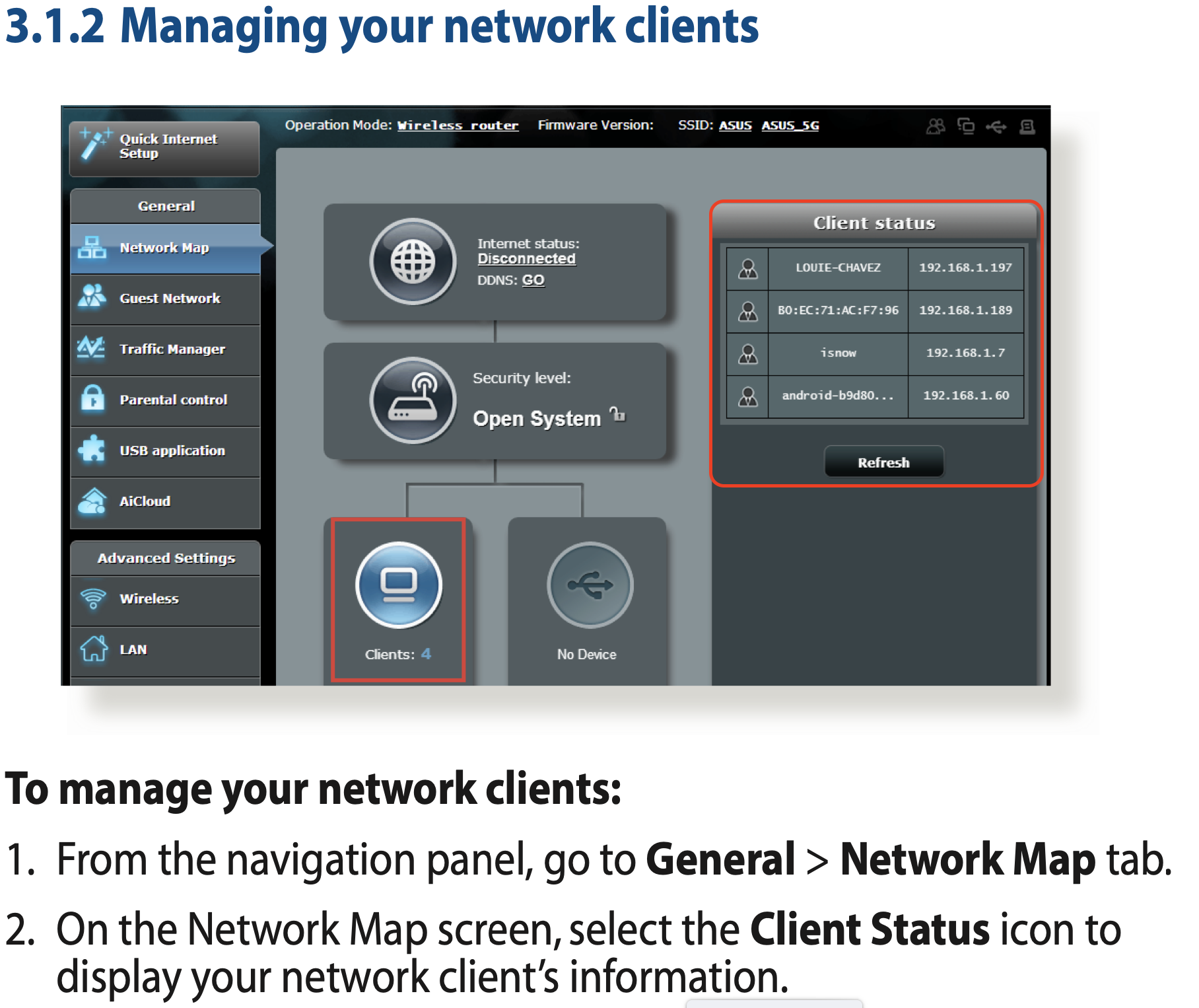 Image below shows clients attached to the ASUS router, you may see them as a name or MAC address. That is why you may need to know the client MAC address to associate it with an IP address so the router can always assign the same IP address to that MAC address.
